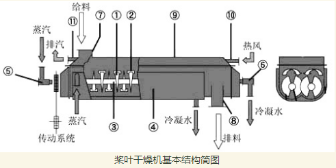 1-楔形葉片;2-攪拌耙板;3-中空軸;4-夾套;5-進汽回轉接頭;6-排水回轉接頭;7-給料口;8-排料口;9-機體;10-進風口;11-排汽口;