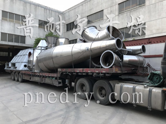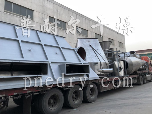 空氣經加熱后由主機底部進風切向進入主主塔,在主塔內形成類似龍卷風的高速旋轉氣流,同時根據不同的物料性質調整風量,使風速處于比較合適的狀態,物料經螺旋加料器直接進入干燥塔,在高速氣流的沖擊和帶動下迅速分散并隨氣流作高速旋轉運動;對于比較大且潮濕的顆粒團,高速氣流不足以使之粉碎并高速旋轉,于是在重力作用下逐漸下落,當落到主機底部時,被底部設置的破碎裝置強行破碎并微?;缓箅S高速氣流一并旋轉上升而完成一次干燥過程,并隨氣流進入旋風干燥進行二次干燥并完成整個干燥過程,經旋風除塵后進入包裝袋入庫,還有一部分沒有下來微粉隨氣流進入脈沖布袋除塵全部回收,尾氣隨風機排放到大氣層,排放標準達到環保要求。