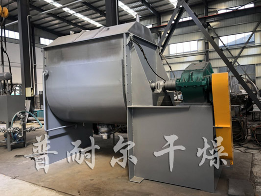 在直聯減速機的驅動下,混合機轉子以定向旋轉,在旋轉的過程中,螺帶一方面把物料推著沿軸向移動,一方面把物料帶起拋向螺帶前上方,而外層螺帶使物料總是向筒體中間運動,內層螺帶則使物料由中間向兩端運動,這樣物料在運動中形成了二個循環物流,在反復循環流動的過程中,物料便得到了充分的混合干燥。