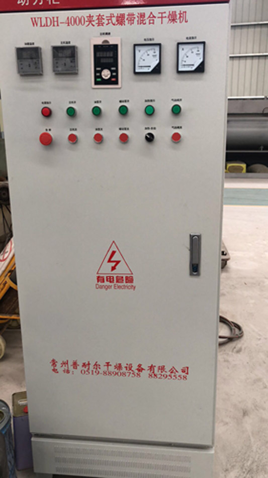 該螺帶混合干燥機型由容器夾套式組成,夾套可熱水蒸汽循環,達到干燥混合制作。該設備頂端設有霧化裝置組成,物料三把二流體噴槍每分鐘霧化12公斤工業油,外保溫、螺旋攪拌葉片和傳動部件 組成:螺旋葉片一般做成雙層或二層,外層螺旋將物料從兩側向中央匯集,內層螺旋將物料從中央兩側輸送,形成對流混合干燥。