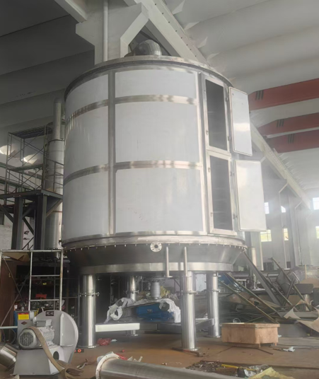 在小干燥盤上的物料移到外緣,并在外緣落到下方的大干燥盤外緣,在大干燥盤上的物料向里移動并從中間落料落入下一層小干燥盤中,大小干燥盤上下交替排列,物料得以連續地流過整個干燥機,